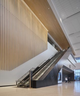 この施設には、フジテックのエレベータ6台、エスカレータ8台、合計14台を納入。エスカレータは、短時間に多くの人が利用するコンベンションセンターの特性を踏まえ、一般的なものより強度を高めた「重負荷仕様」となっています。