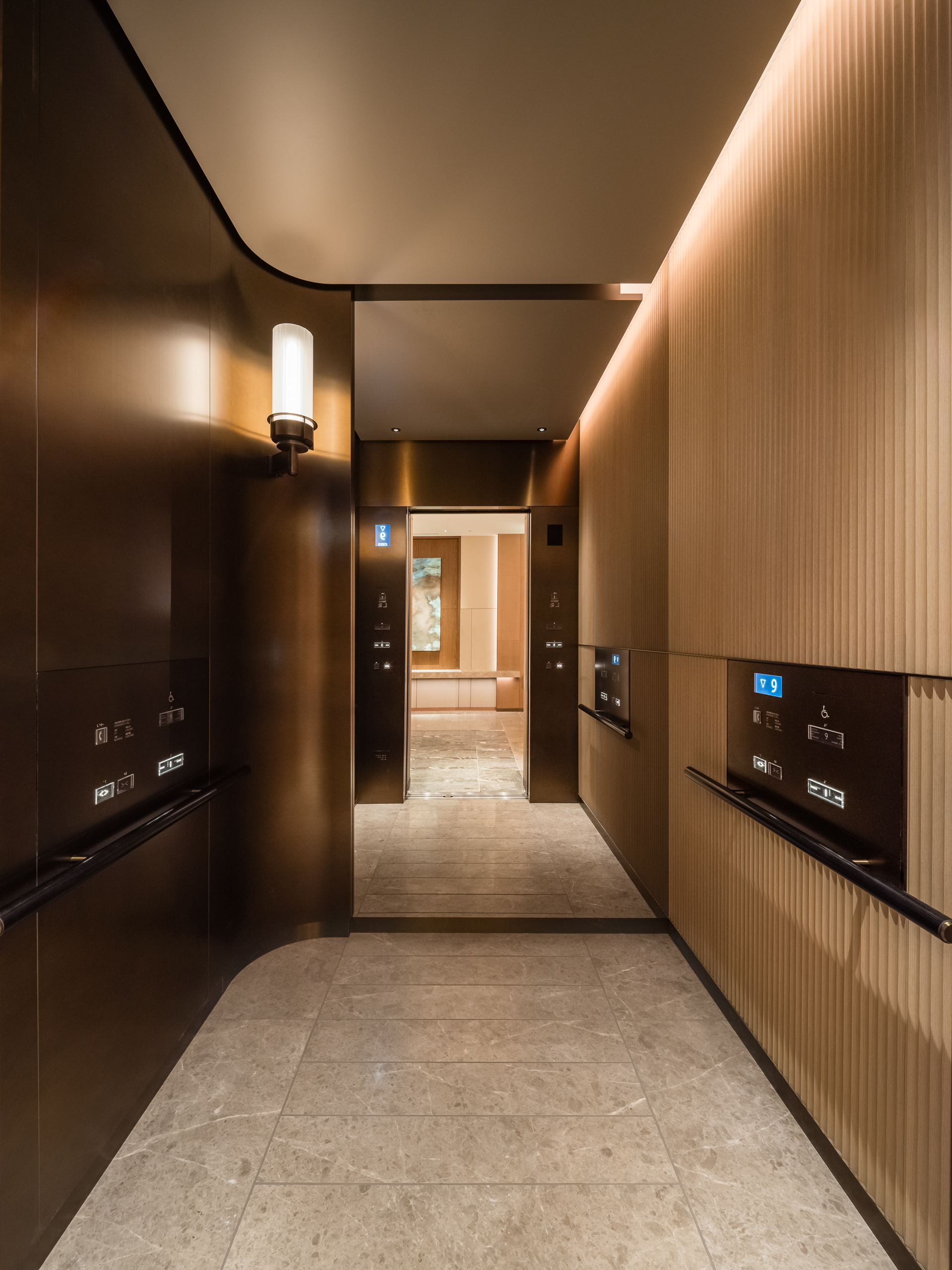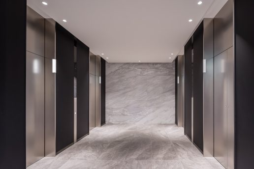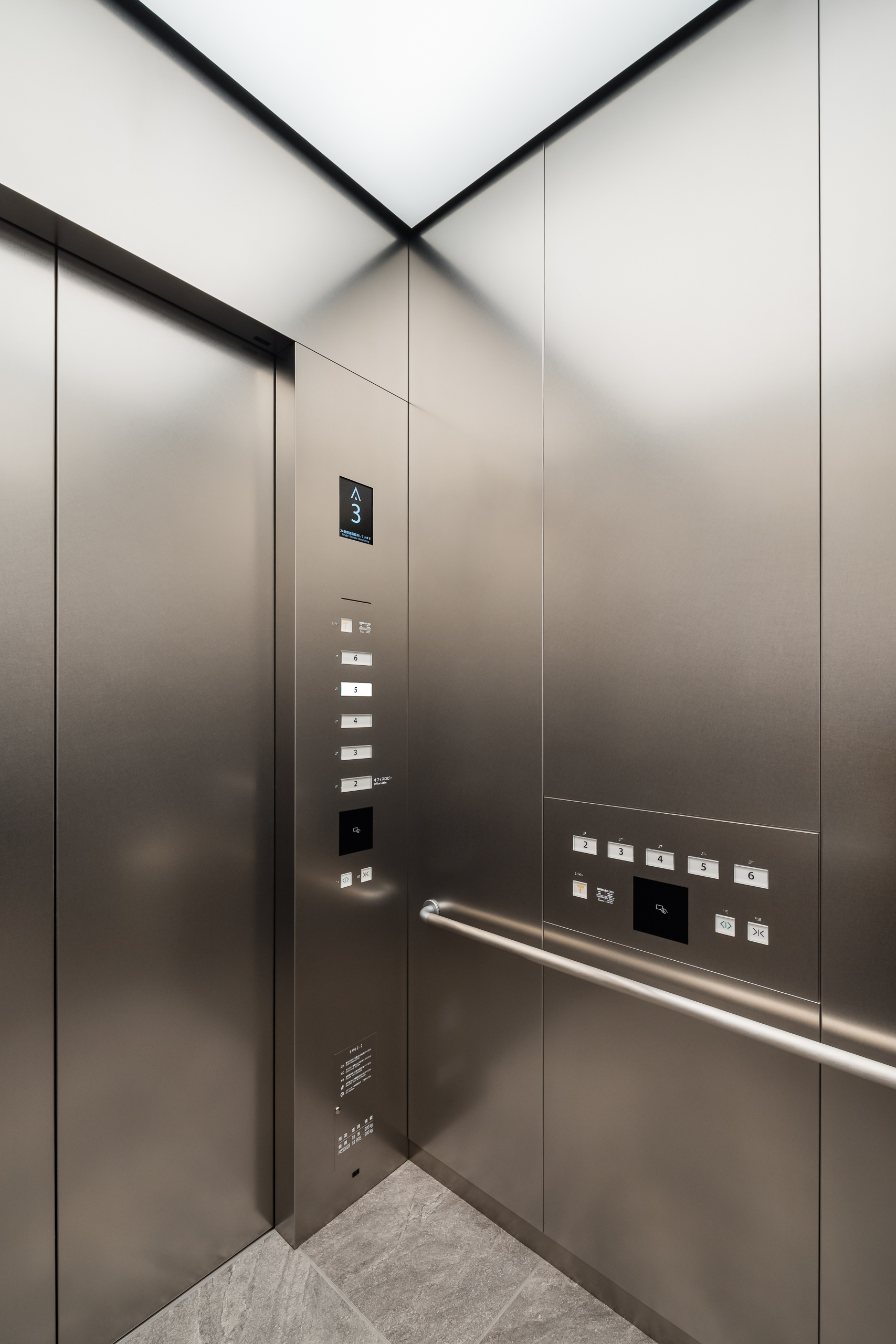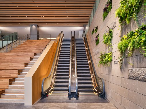 「インターコンチネンタル札幌」のエレベータは、間接照明と一面だけあしらった木リブパネルが印象的で、柔らかな光を放つブラケットライトや石畳風の床材と調和し、利用者に心地よい移動空間を演出しています。オフィスフロアのエレベータにはステンレス仕上げを採用し、洗練された印象に仕上げています。また、エレベータホールへと続くエスカレータにはスカートガードLED照明を設置し、光ムラのない自然な光で足元を照らすことで、スタイリッシュかつ安心感のある空間を実現しています。