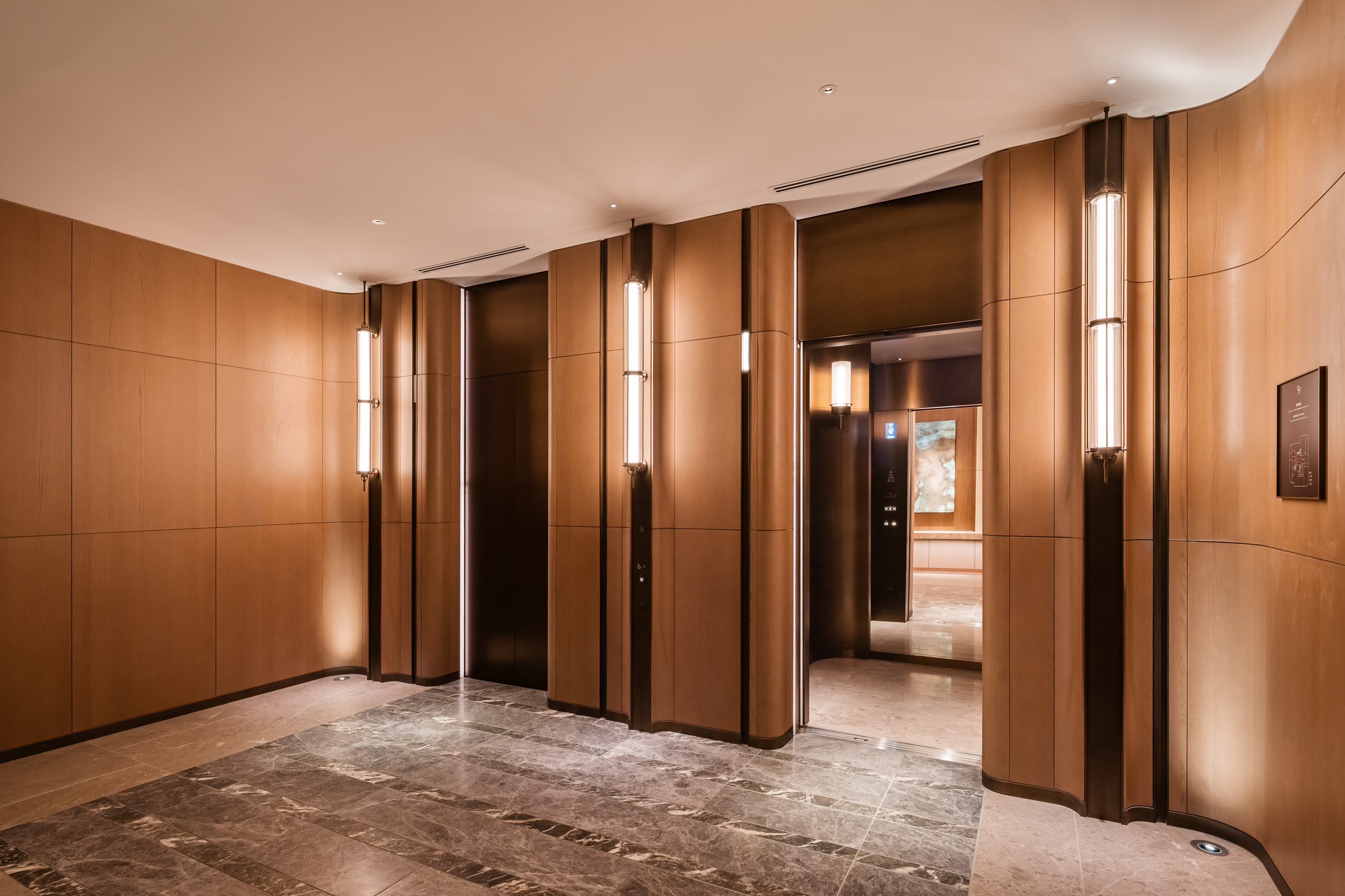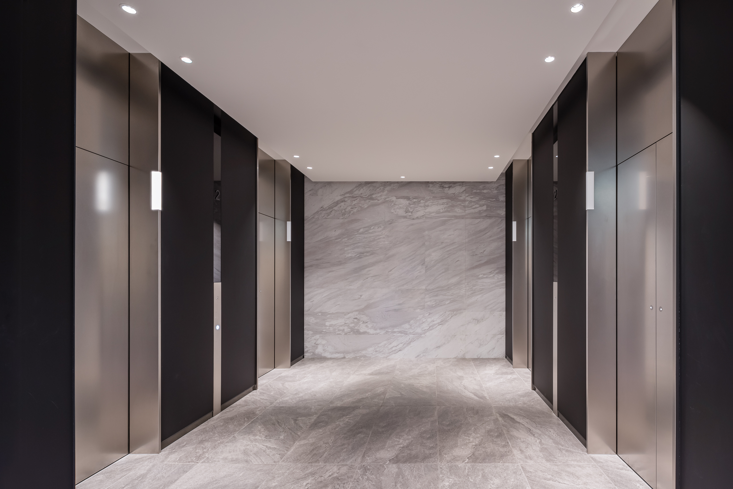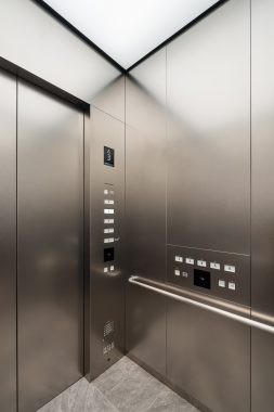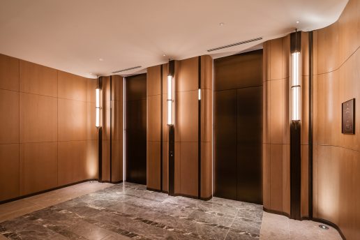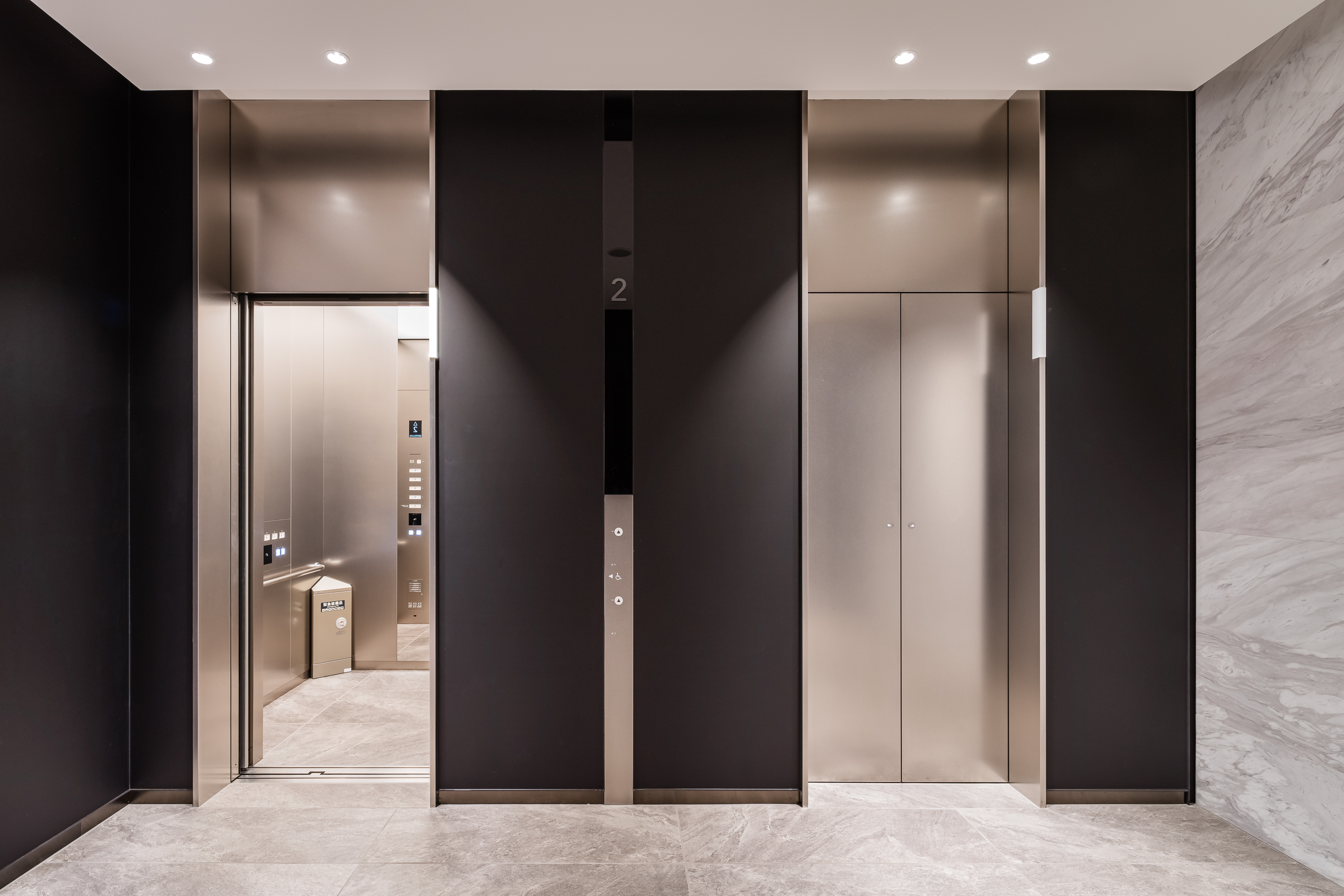 「インターコンチネンタル札幌」のエレベータは、間接照明と一面だけあしらった木リブパネルが印象的で、柔らかな光を放つブラケットライトや石畳風の床材と調和し、利用者に心地よい移動空間を演出しています。オフィスフロアのエレベータにはステンレス仕上げを採用し、洗練された印象に仕上げています。また、エレベータホールへと続くエスカレータにはスカートガードLED照明を設置し、光ムラのない自然な光で足元を照らすことで、スタイリッシュかつ安心感のある空間を実現しています。