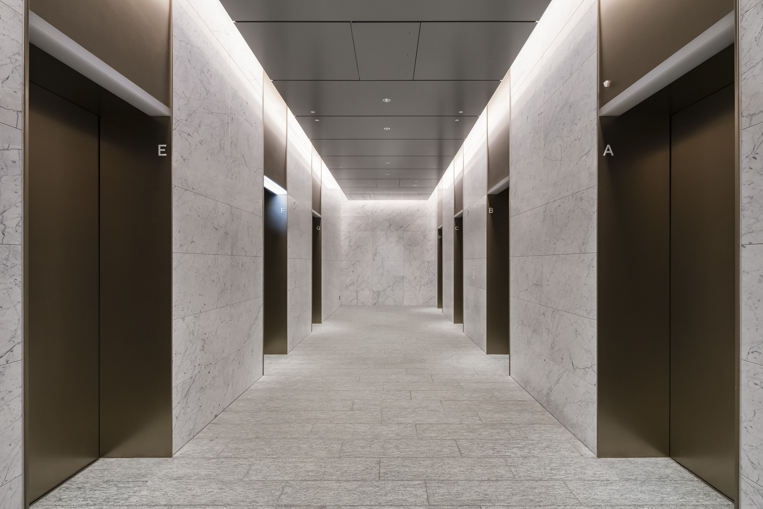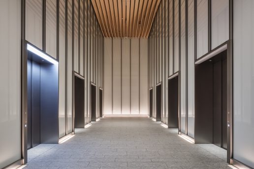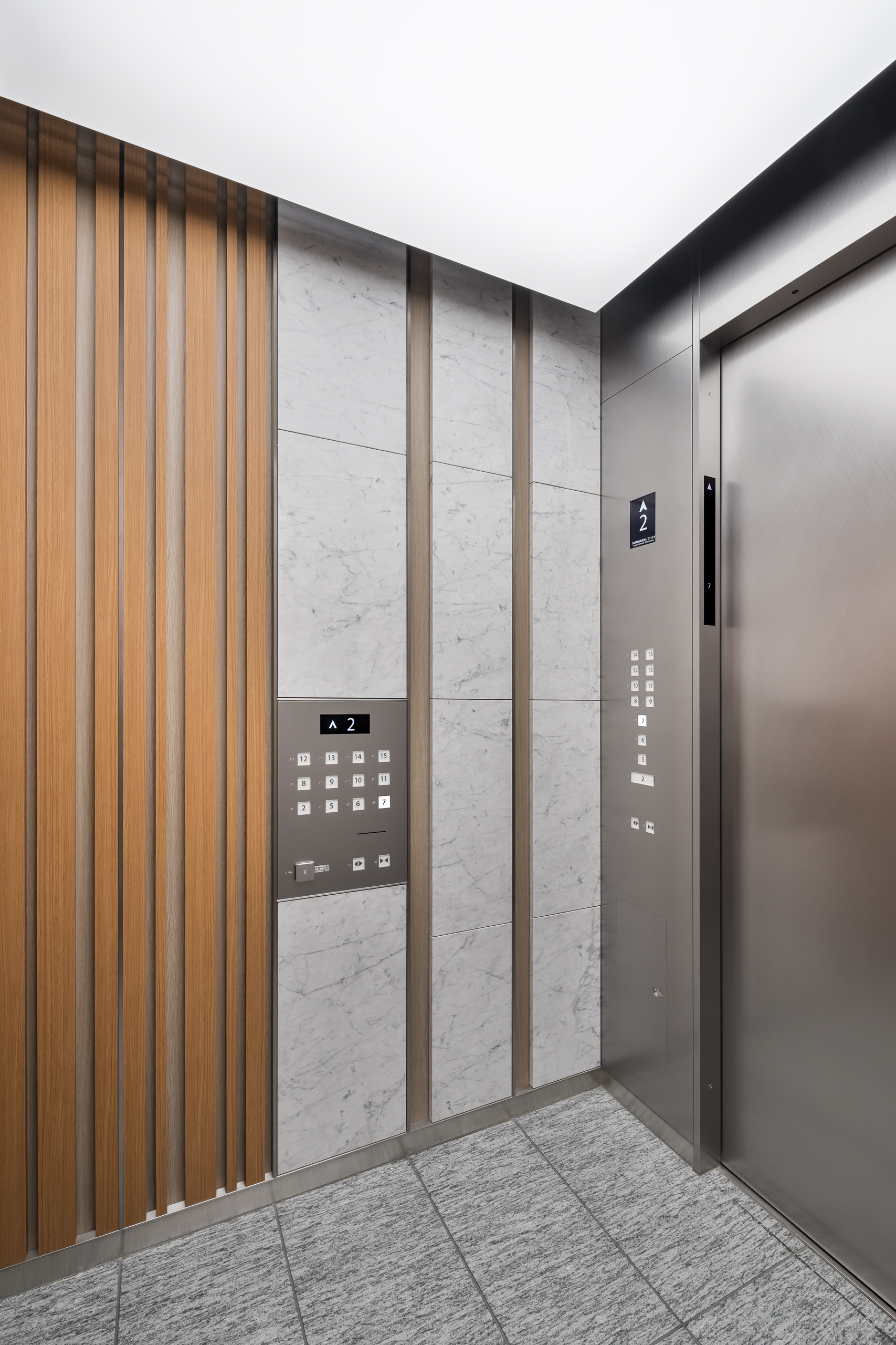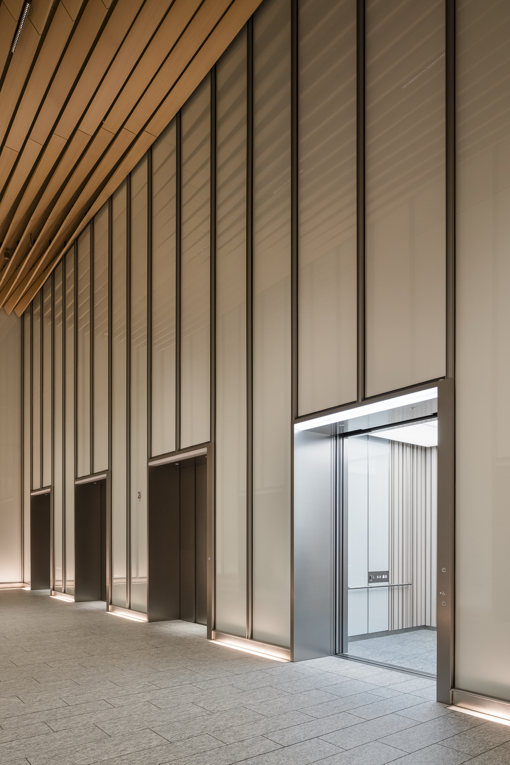 ここに、フジテックのエレベータ50台、エスカレータ34台を納入しました。 エレベータは、警備・清掃・デリバリーなどのサービスロボットと連携し、自律移動を可能にする仕様を採用。また、54人乗りのシャトルエレベータにより、オフィスのラッシュ時の混雑を効果的に緩和します。意匠面では、木リブパネルや大理石調の仕上げを採用し、乗り場の上質で落ち着いた空間デザインと調和させています。