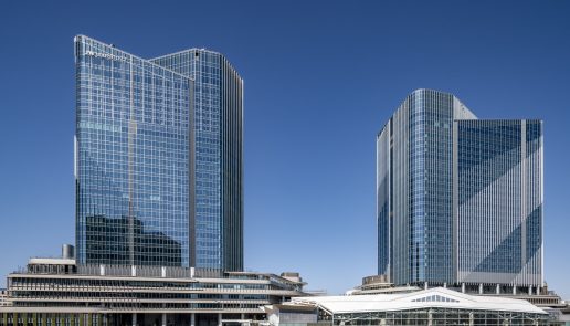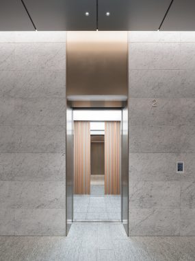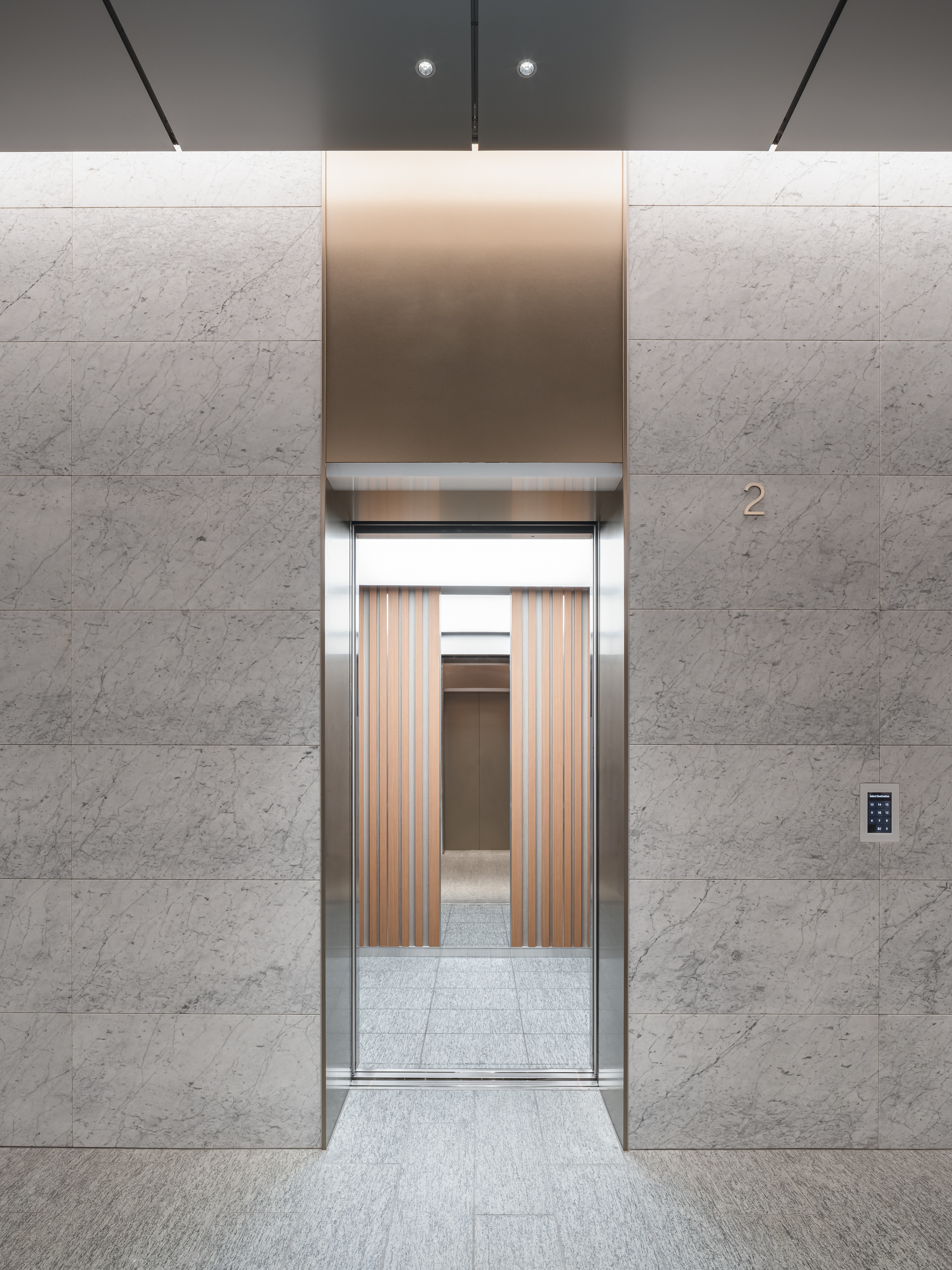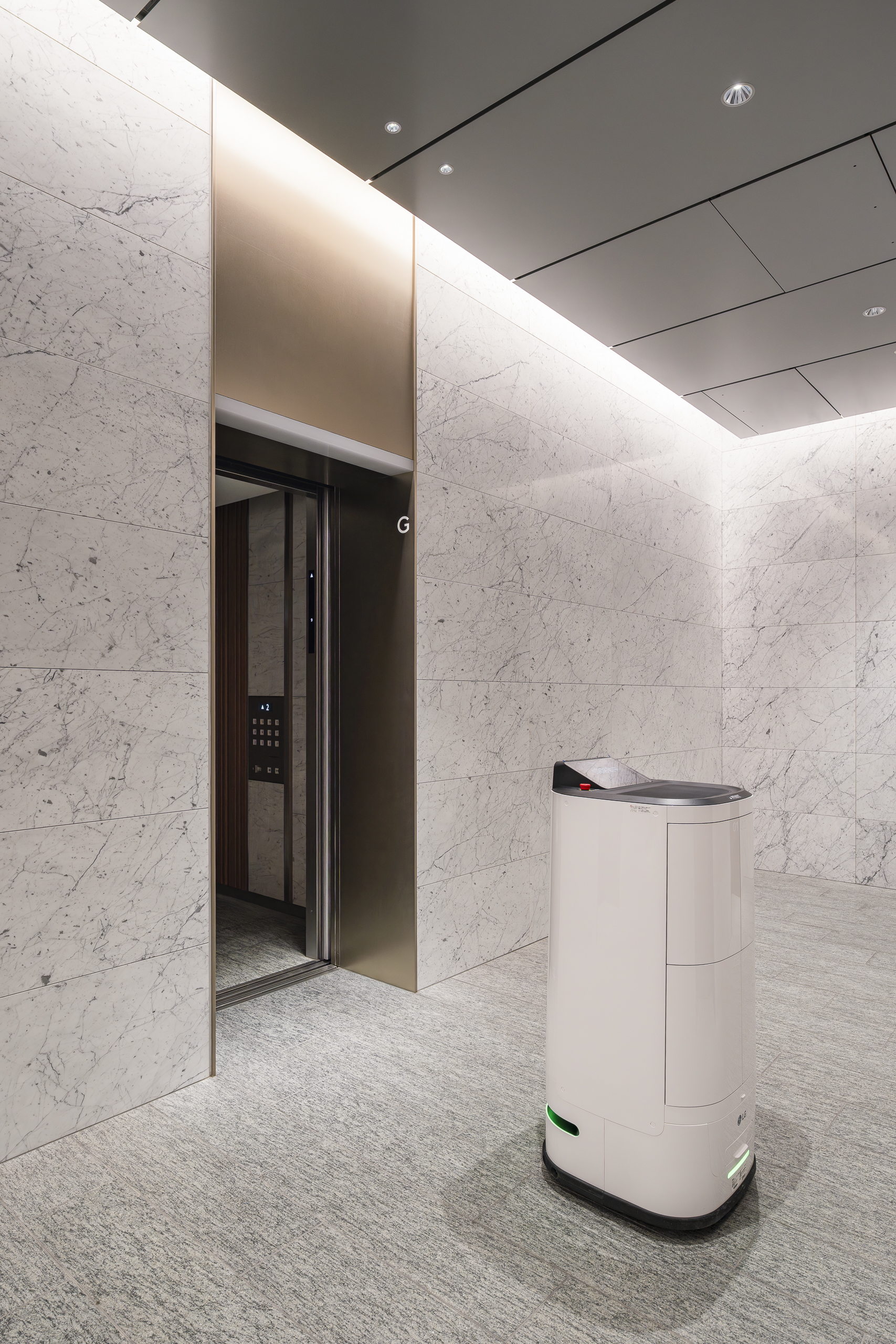 ここに、フジテックのエレベータ50台、エスカレータ34台を納入しました。 エレベータは、警備・清掃・デリバリーなどのサービスロボットと連携し、自律移動を可能にする仕様を採用。また、54人乗りのシャトルエレベータにより、オフィスのラッシュ時の混雑を効果的に緩和します。意匠面では、木リブパネルや大理石調の仕上げを採用し、乗り場の上質で落ち着いた空間デザインと調和させています。