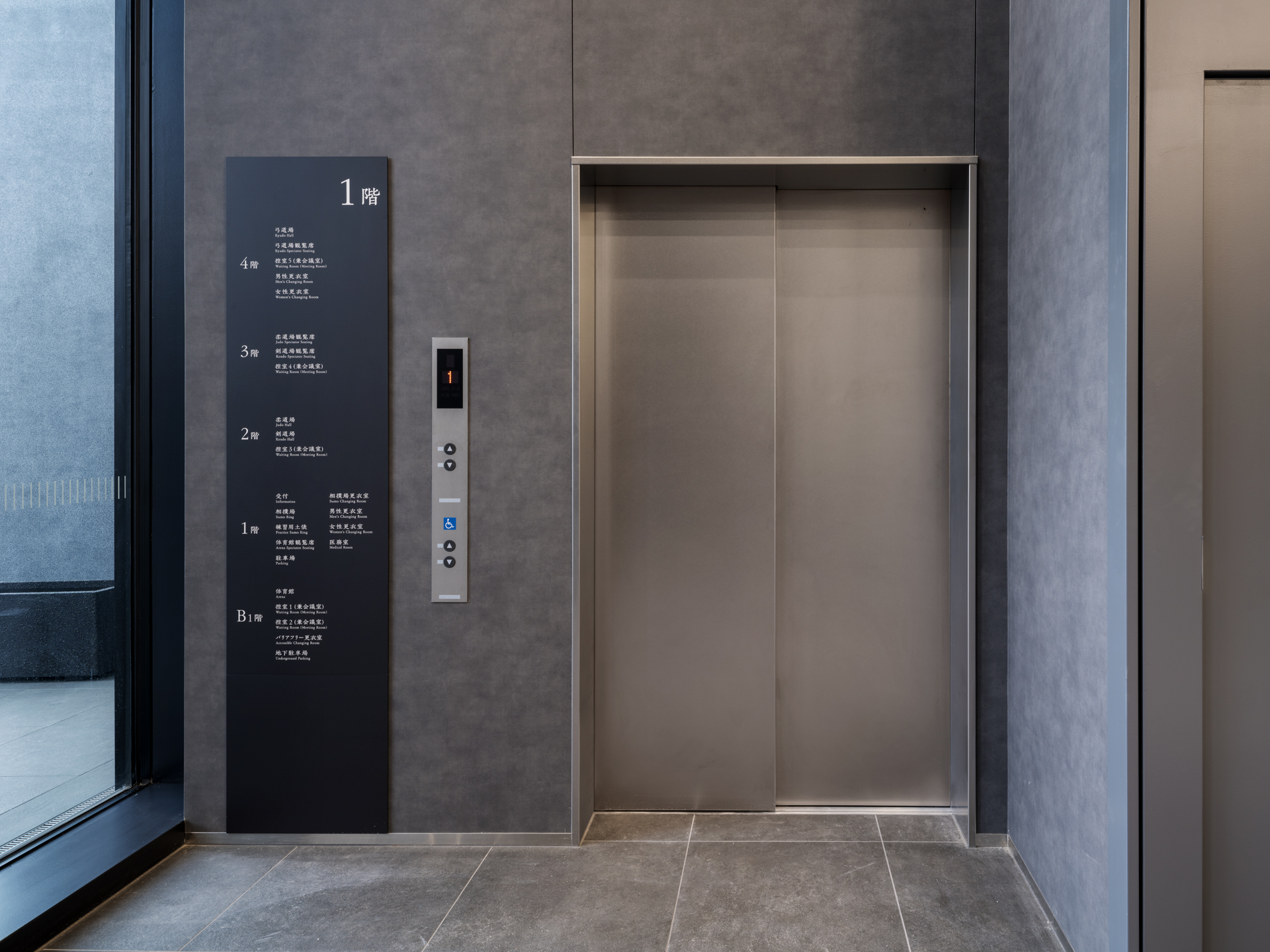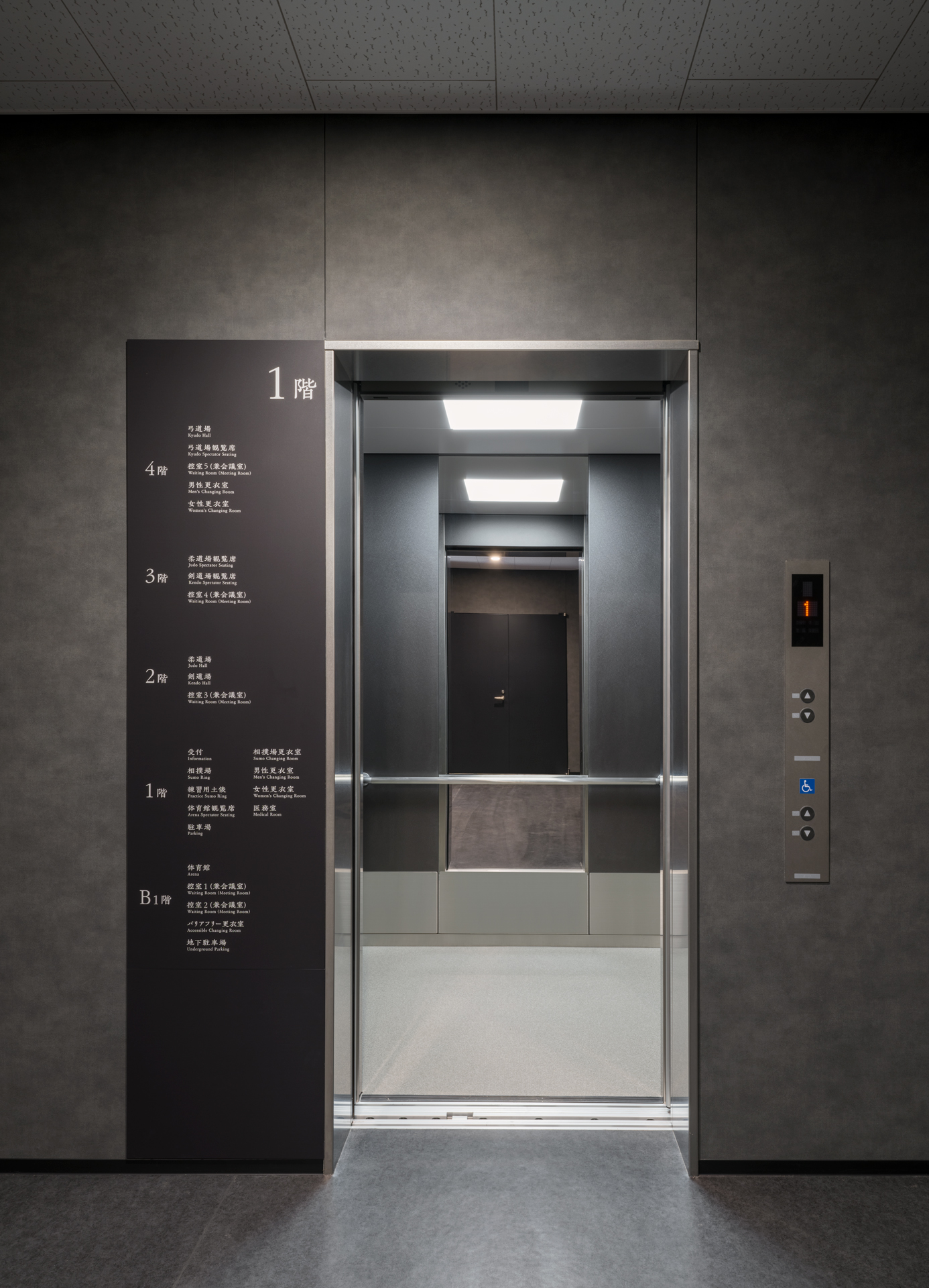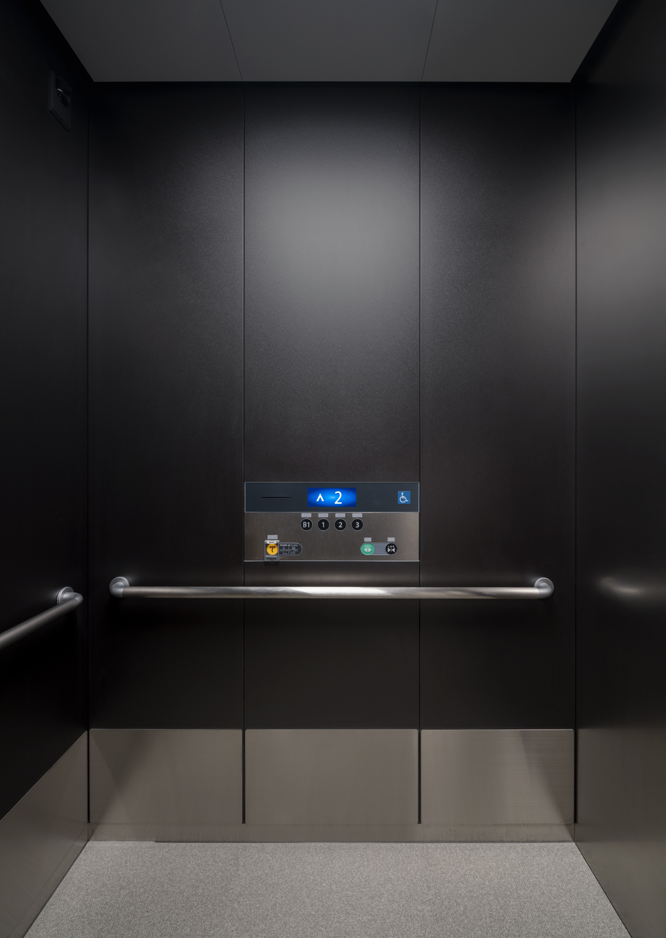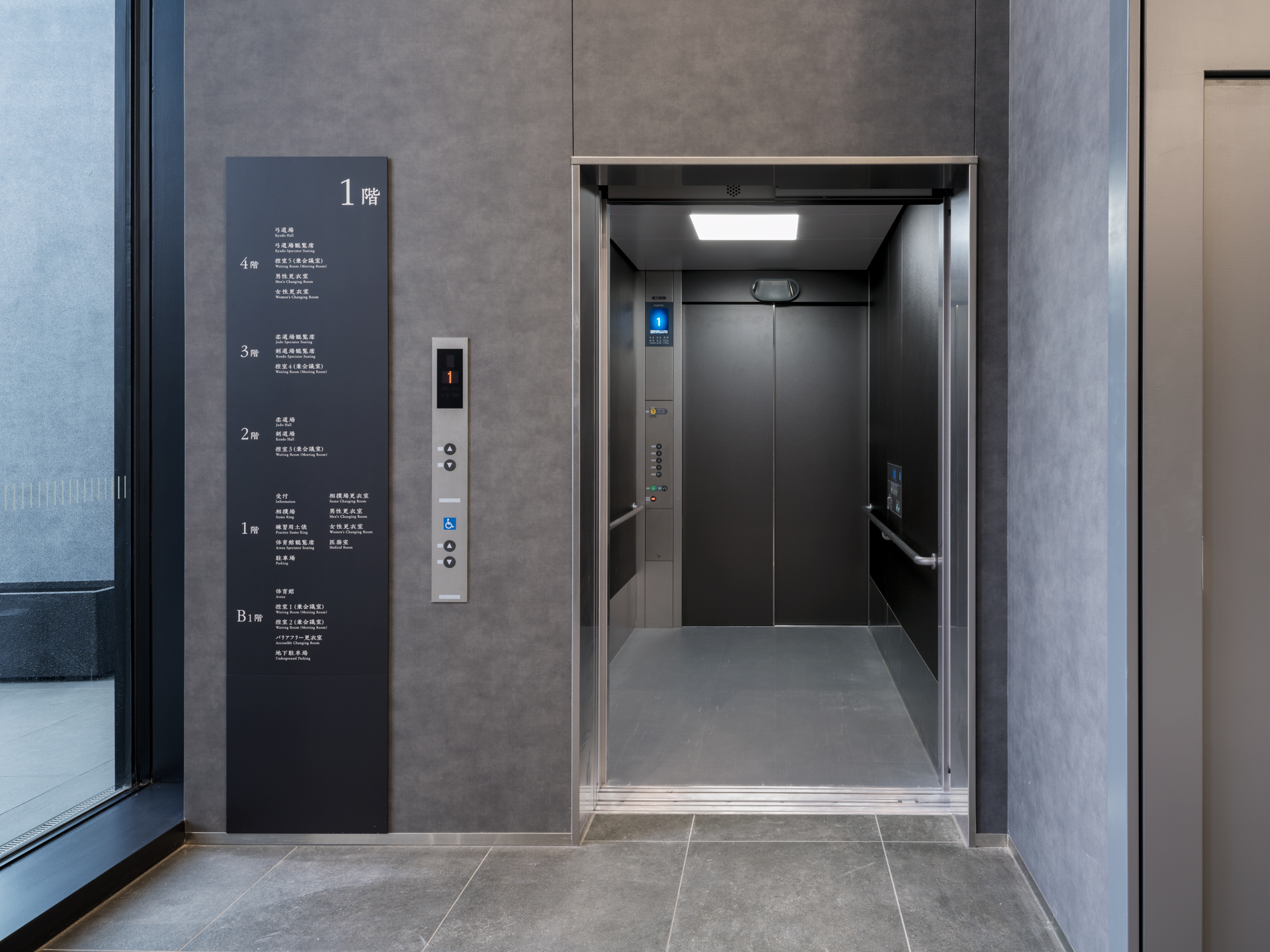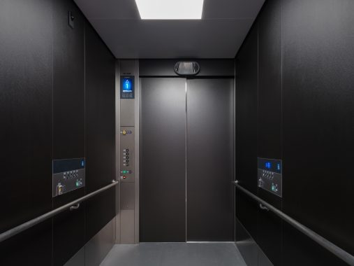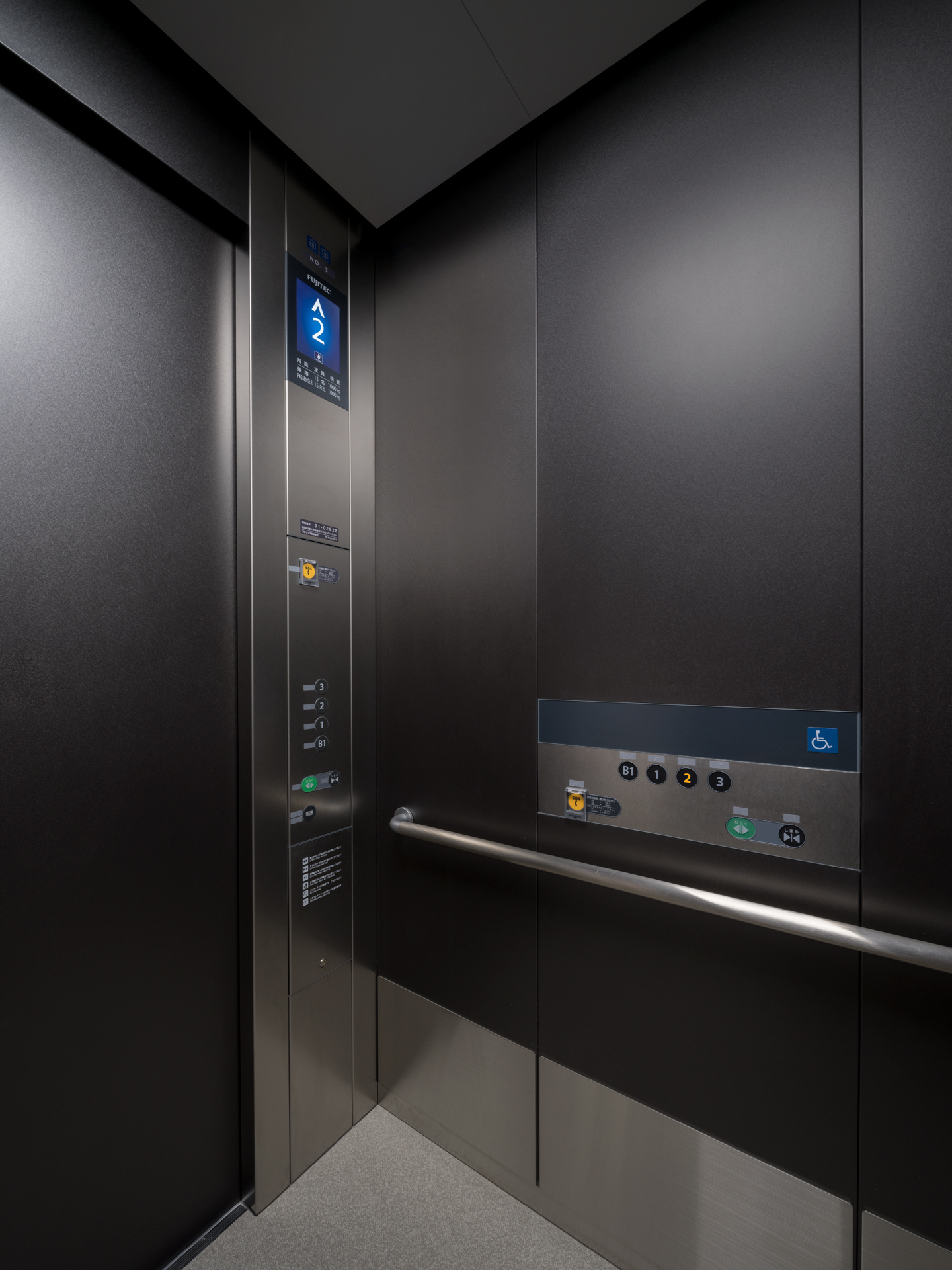 この施設にフジテックはエレベータを3台納入。黒を基調としたシンプルでシックなデザインにより、和の建築美を損なうことなく、快適で”安全・安心”な移動を支えています。