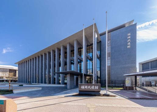 福岡武道館は、武道の精神と福岡の文化を融合させた地域の新たな象徴として誕生した施設です。大庇(おおびさし)と列柱がつくる縁側のような空間が外と内をやわらかにつなぎ、和のおもてなしを感じさせます。外観は博多織の意匠を取り入れ、力強さと気品を表現。木ルーバーの温もりや夜に行燈のように灯る光が、凜とした佇まいと穏やかな情感を生み出しています。