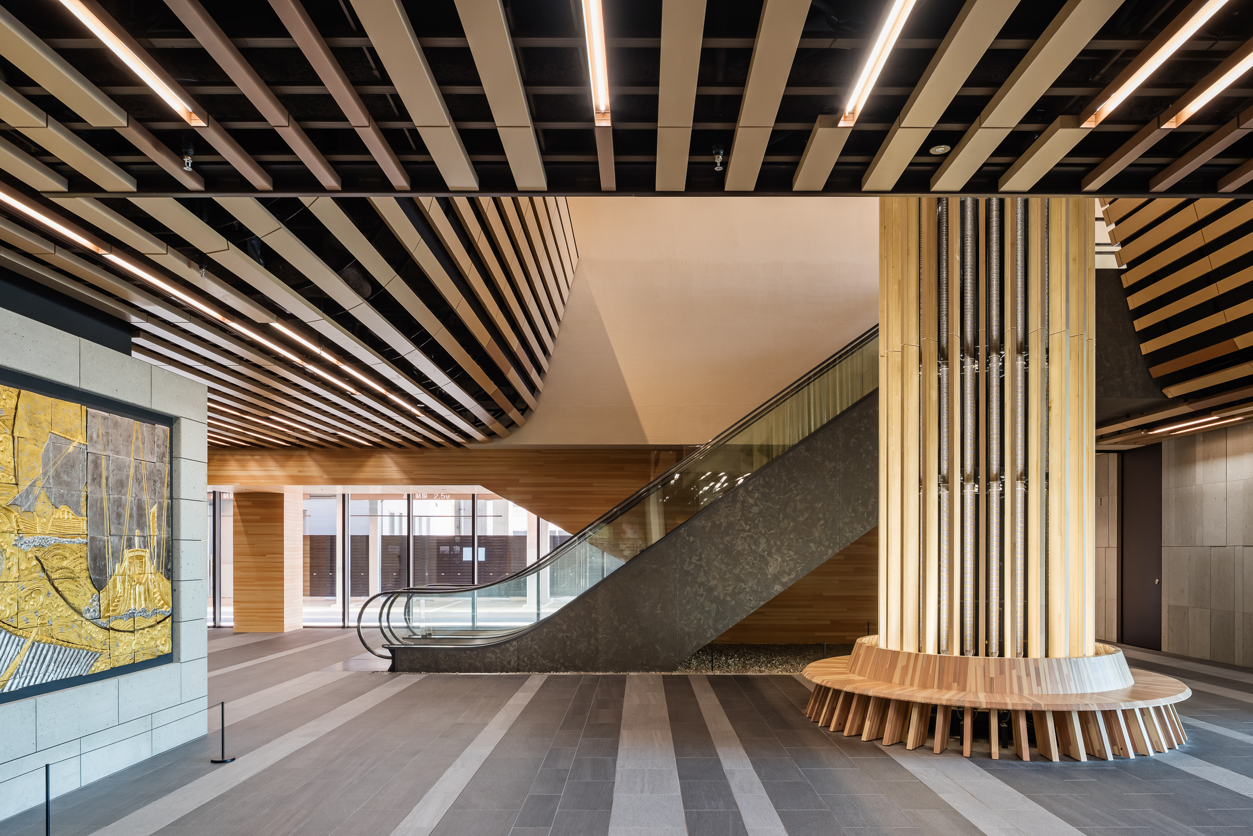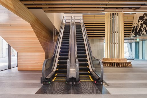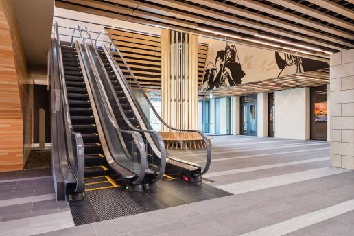 エスカレータの外装板は、周辺の内装に多く使われている小松産の石材の風合いをイメージさせる特殊なテクスチャのパネルを採用し、エスカレータまでもが内装の統一感を高める、洗練された空間を創り出しています。