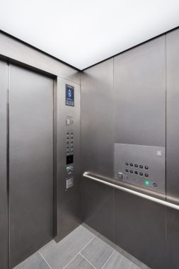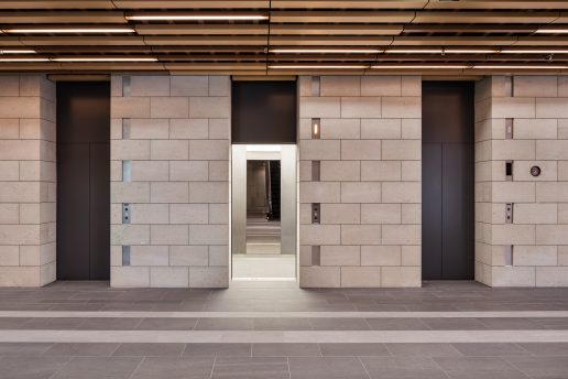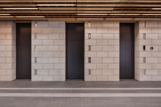 乗り場では呼び出しボタン部をわずかに壁面よりへこませた陰影のあるデザインで、繊細な美しさを表現しています。内装はステンレスを基調とし、床面には石材を採用。周辺の壁面に多く使用されている石材の質感と調和させ、上質な統一感を演出しています。