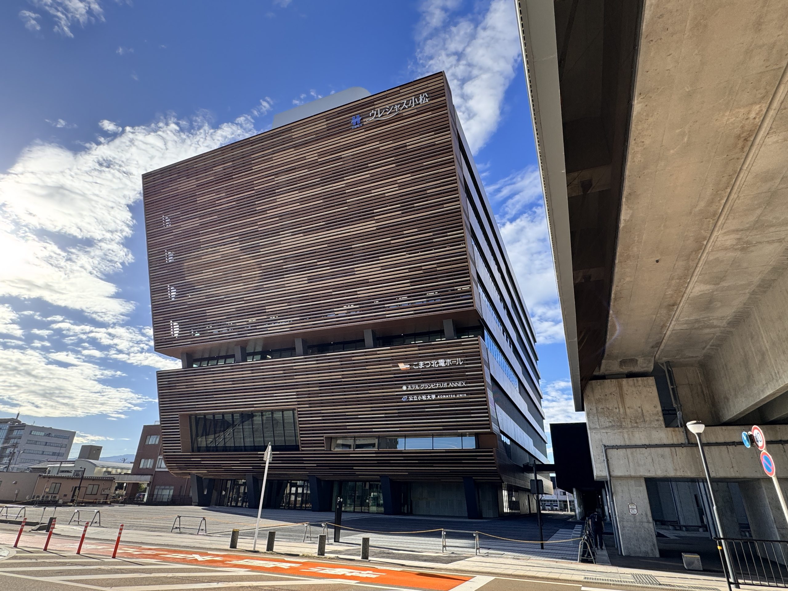 「ウレシャス小松」は、小松駅前に立つ、ホール、オフィス、大学キャンパス、ホテルなど多様な機能が集積した複合施設です。北前船をモチーフにした外観や、地元の木材・石材を積極的に使用した内装デザインなど、「小松らしさ」を追求した次世代のランドマークです。