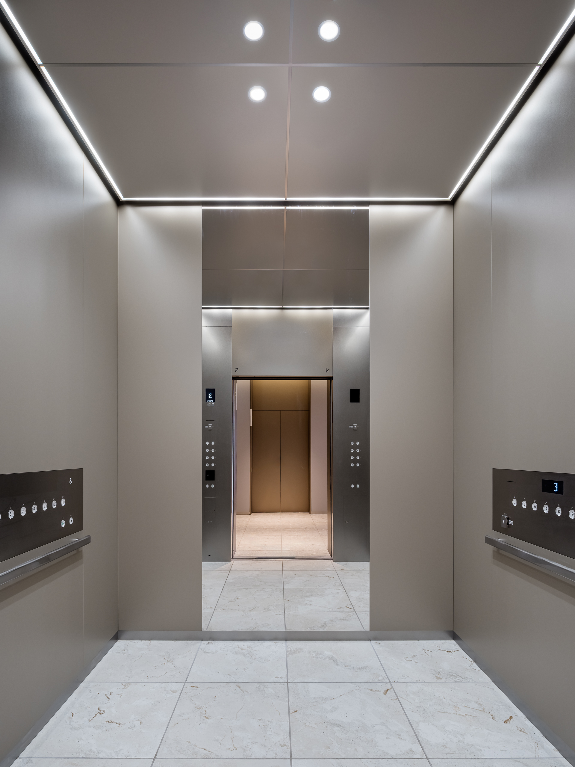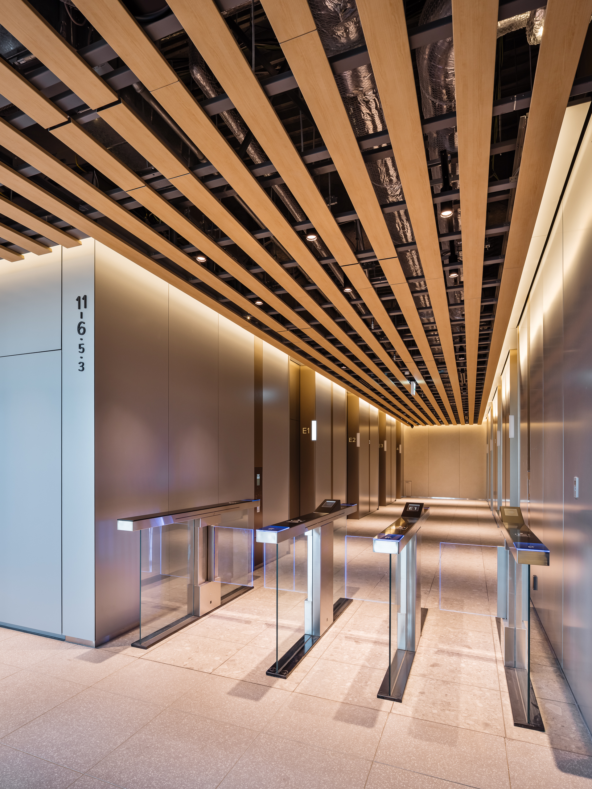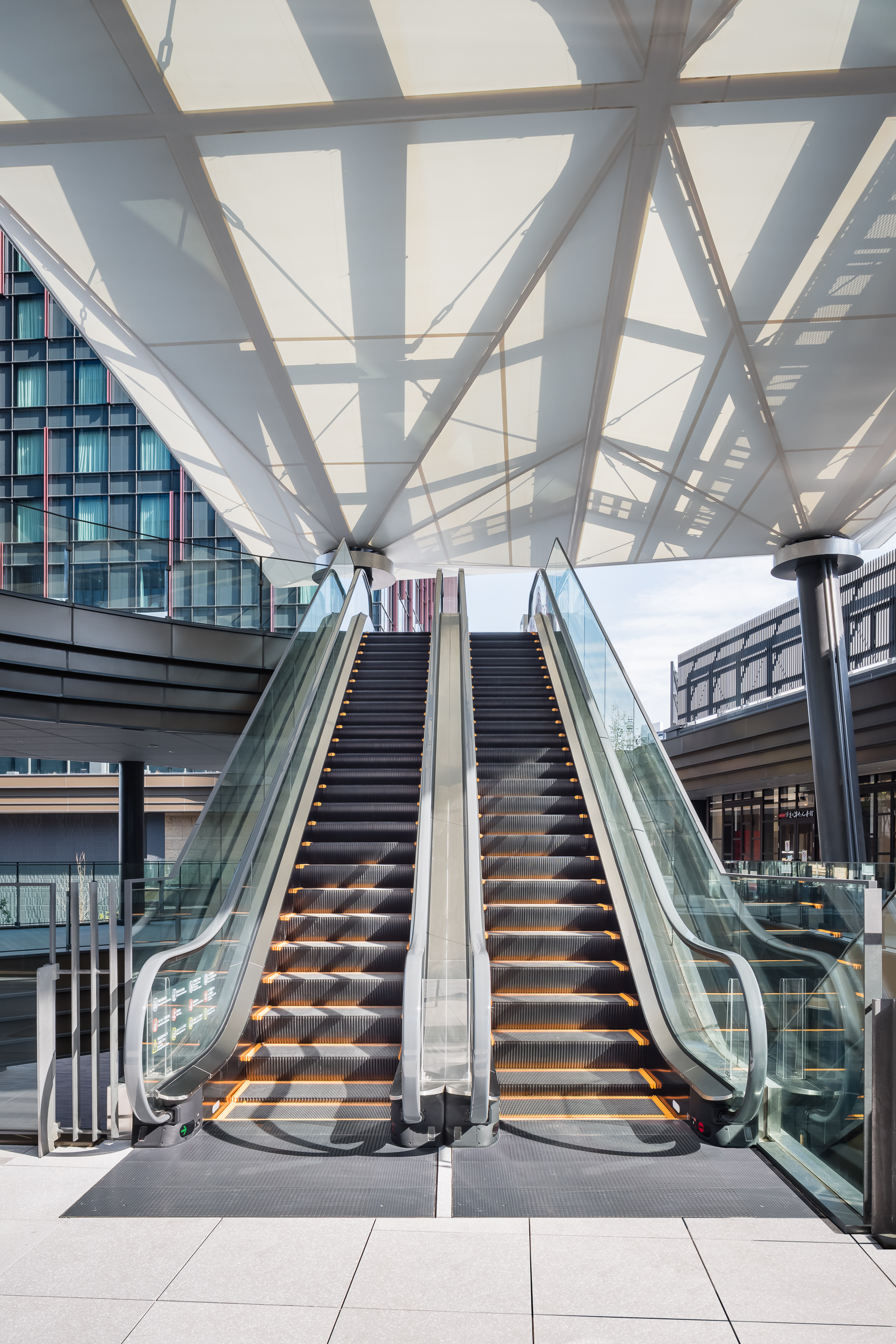 ここにフジテックは、エレベータ46台、エスカレータ32台、合計76台を納入。オフィス棟のエレベータには、混雑を緩和し効率的な運行を実現する行先階登録システム「EZSHUTTLE」を搭載し、スムーズな縦移動をサポートしています。エスカレータはオフィスおよび商業エリアの動線に合わせて配置され、利用者の流れに配慮した快適な移動環境を実現しています。商業棟のエレベータにはカラーステンレスを採用し、施設の空間デザインと一体感のある意匠としています。また、駅前広場側には展望用エレベータを配置し、街とつながる立体的な移動空間を演出しています。
