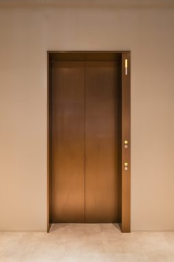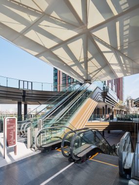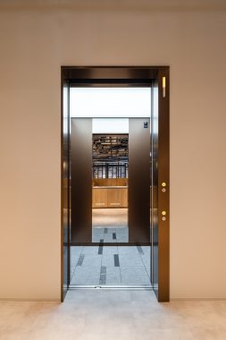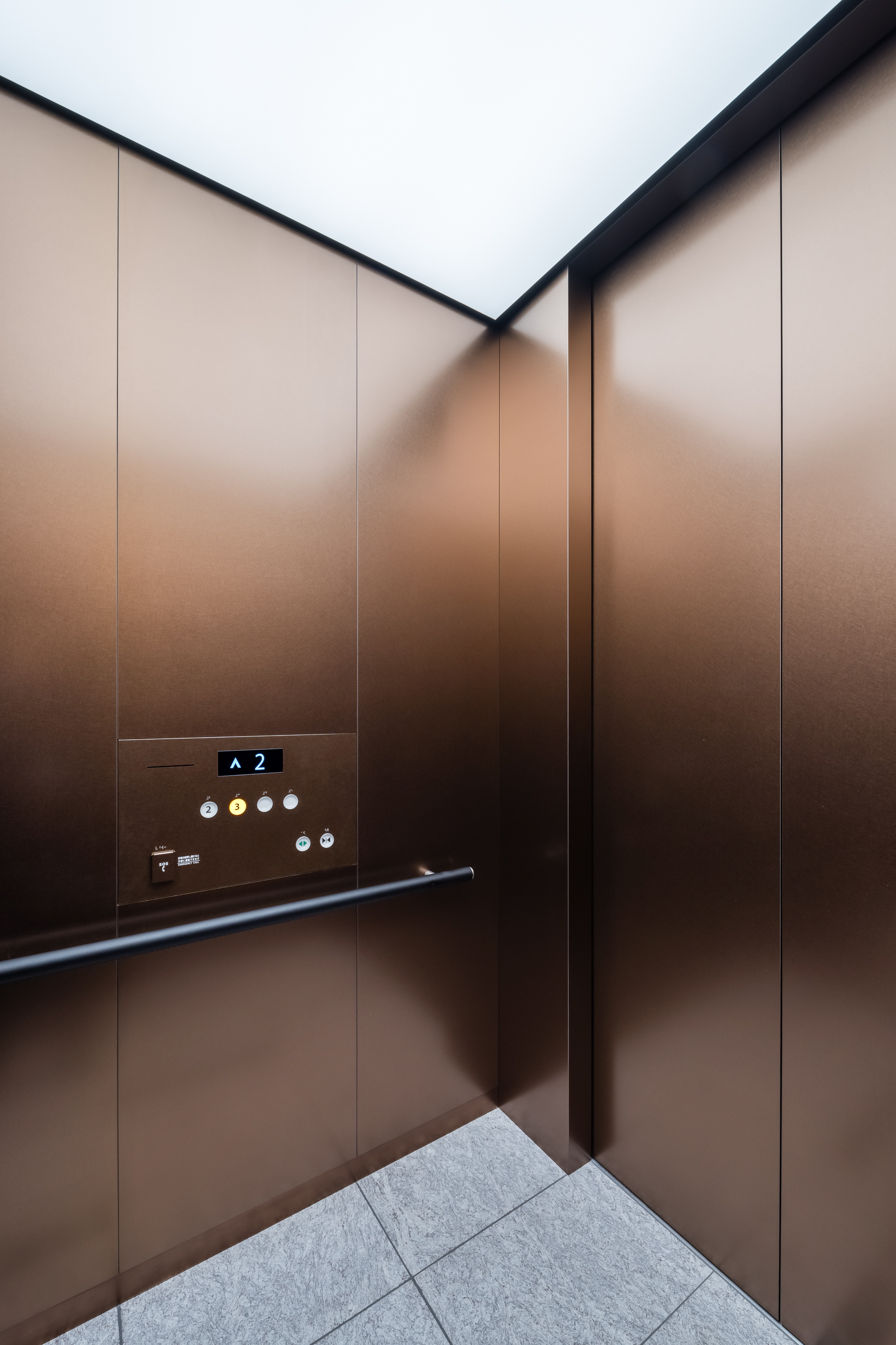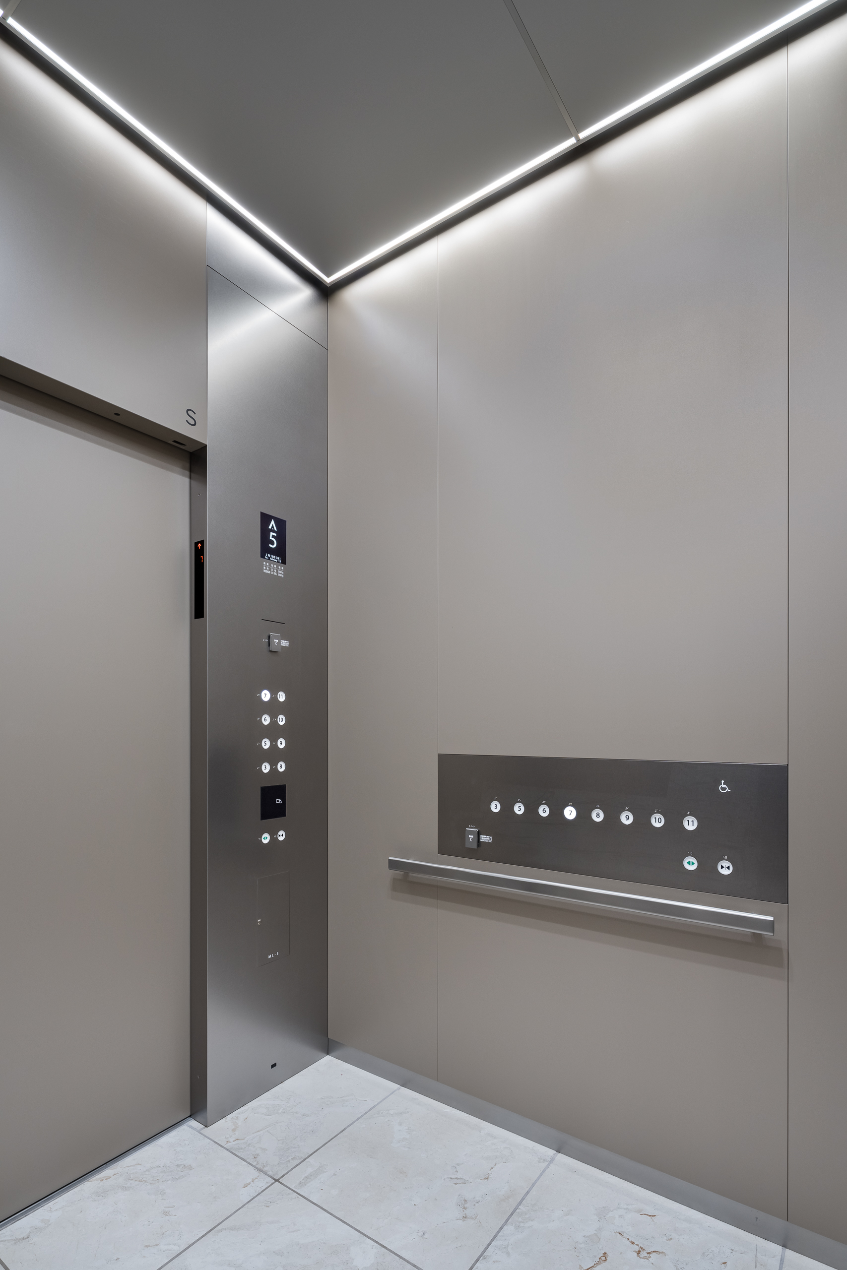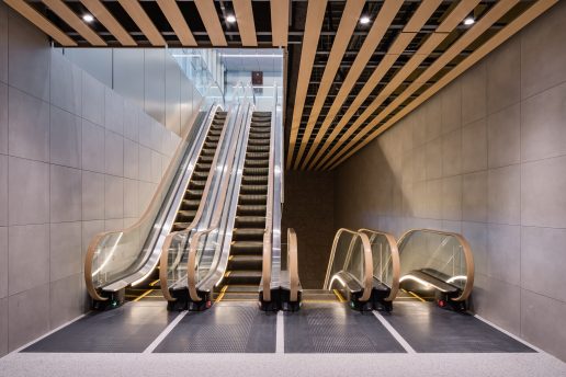 ここにフジテックは、エレベータ46台、エスカレータ32台、合計76台を納入。オフィス棟のエレベータには、混雑を緩和し効率的な運行を実現する行先階登録システム「EZSHUTTLE」を搭載し、スムーズな縦移動をサポートしています。エスカレータはオフィスおよび商業エリアの動線に合わせて配置され、利用者の流れに配慮した快適な移動環境を実現しています。商業棟のエレベータにはカラーステンレスを採用し、施設の空間デザインと一体感のある意匠としています。また、駅前広場側には展望用エレベータを配置し、街とつながる立体的な移動空間を演出しています。