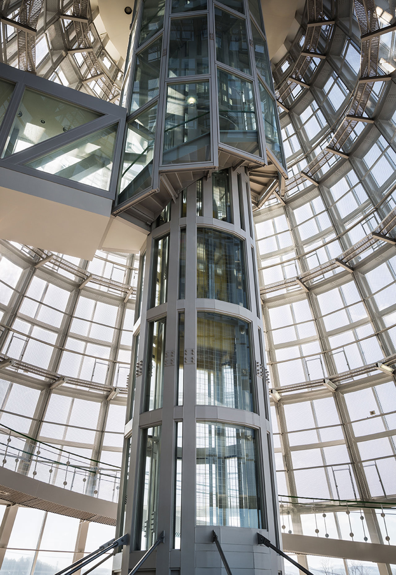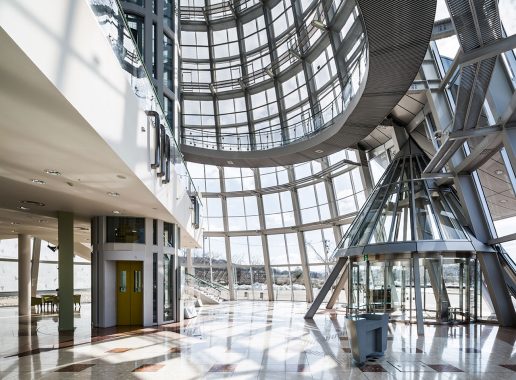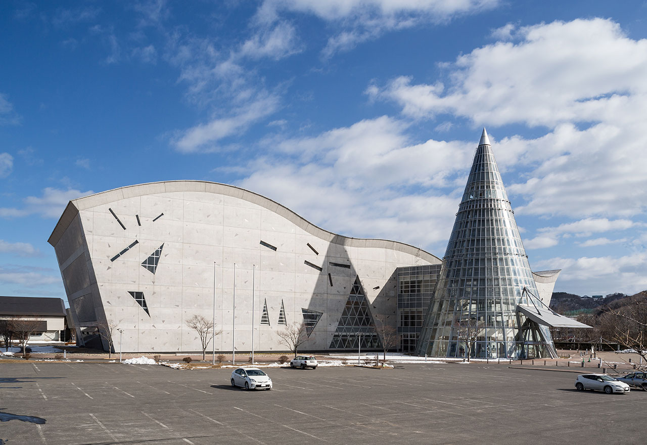 建物の設計は建築家・黒川紀章氏によるもの。円錐形のエントランスホールや波型の大きな屋根が印象的です。