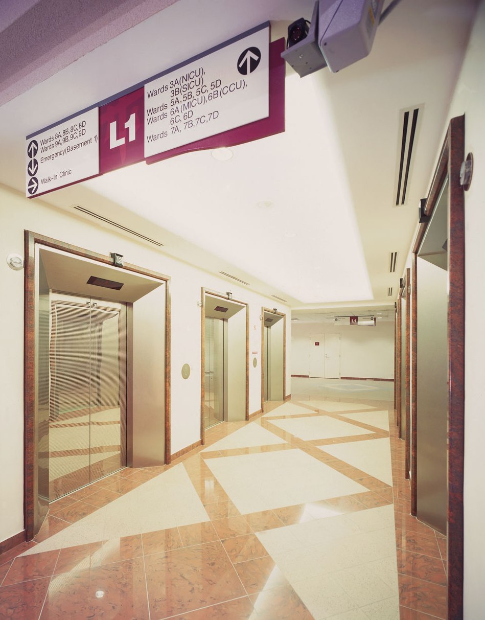 シンガポール最大の規模を誇る国立病院が、「タン・トク・セン病院」です。地上15階、地下3階建の同病院は、最先端の医療設備が完備されており、ここには分速210mの高速機種を含むエレベータ45台と、エスカレータ8台が活躍しています。とりわけ、エレベータには、先進の「ネットワーク・モニタリング・システム」を採用。パソコンからLAN(構内情報通信網)を経由してエレベータの運行を遠隔監視・制御できるもので、医療施設におけるエレベータ管理に、大いに威力を発揮しています。